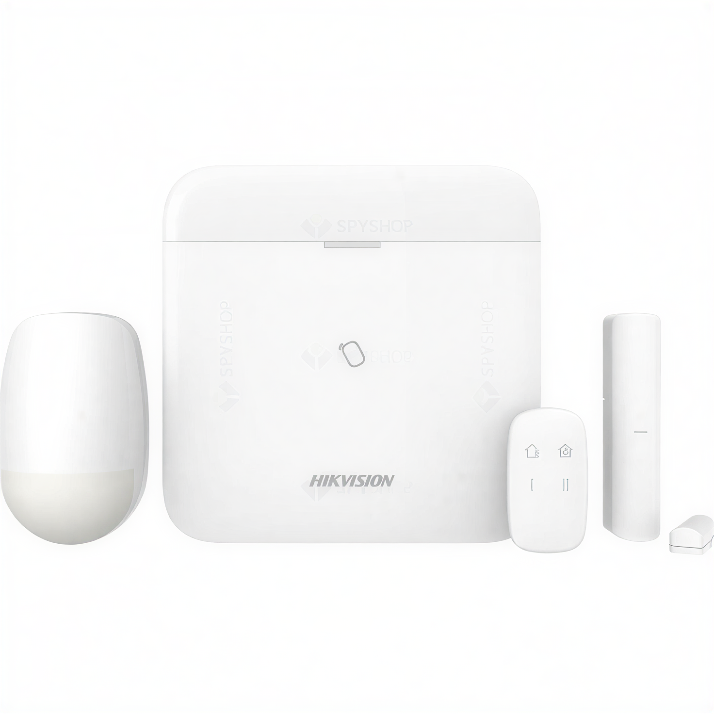 Kitul include centrala DS-PWA96-M-WE, un detector PIR, un contact magnetic, o telecomandă și 3 taguri de proximitate.